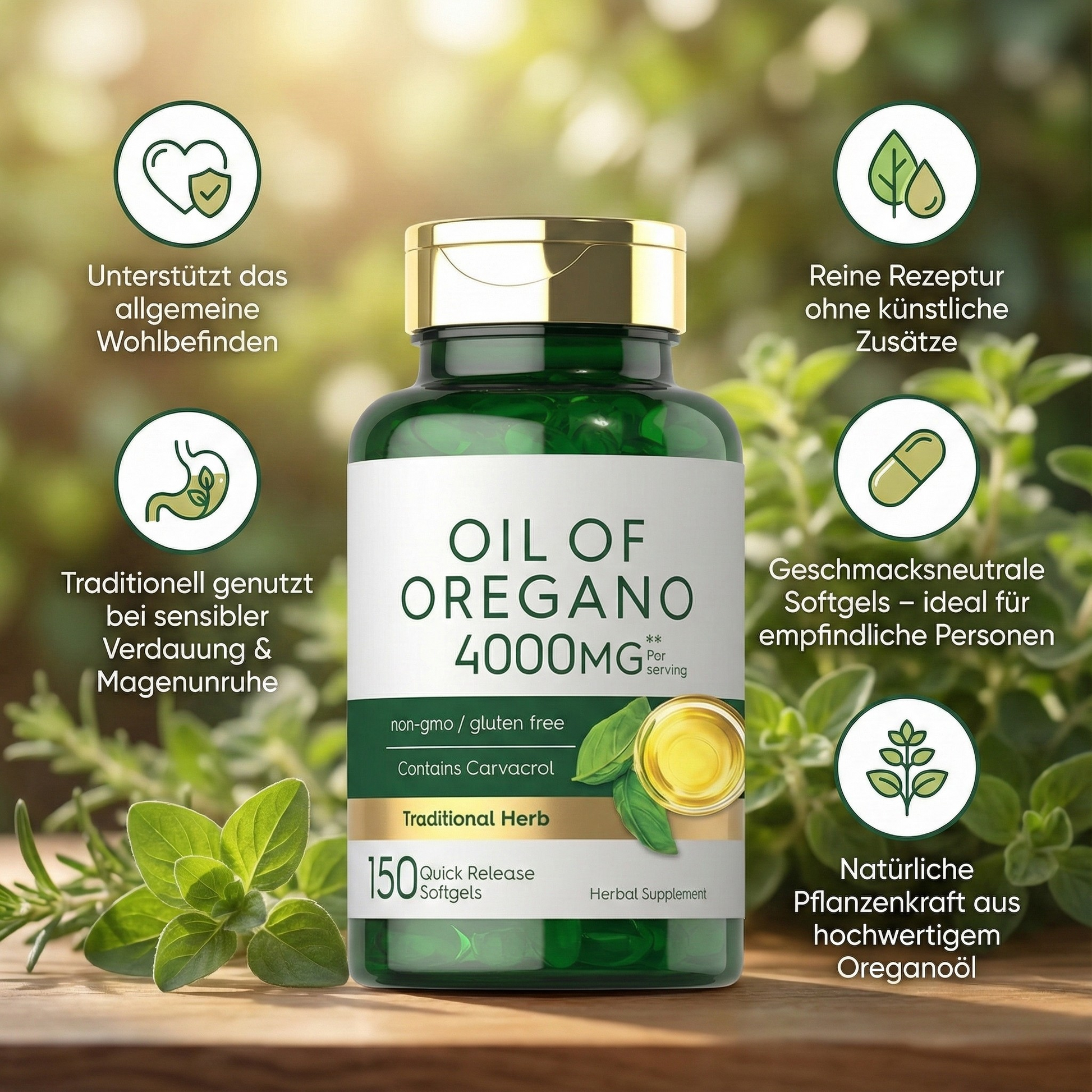 Oreganoöl wird seit Jahrhunderten als traditionelles Kräuterextrakt geschätzt, das zu einem angenehmen Gefühl im Bauchbereich und einer allgemeinen inneren Balance beitragen kann. Die enthaltenen natürlichen Pflanzenstoffe, darunter Carvacrol, werden häufig mit einem harmonischen Körperempfinden in Verbindung gebracht.